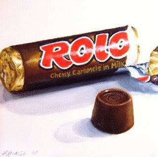 For my Studio I class we had to replicate any still life painting of our choosing. So (naturally), I went to Google images and began my search. I was looking to do something kind of different (most still lifes are of fruit), so I choose a painting of Rolos! I found it on Lara Harris' Flickr account, studiolara316, and I want to give her credit for her nifty painting. I'm going to put it on here so you can compare. Original first and then my interpretation. Tell me what you think!!